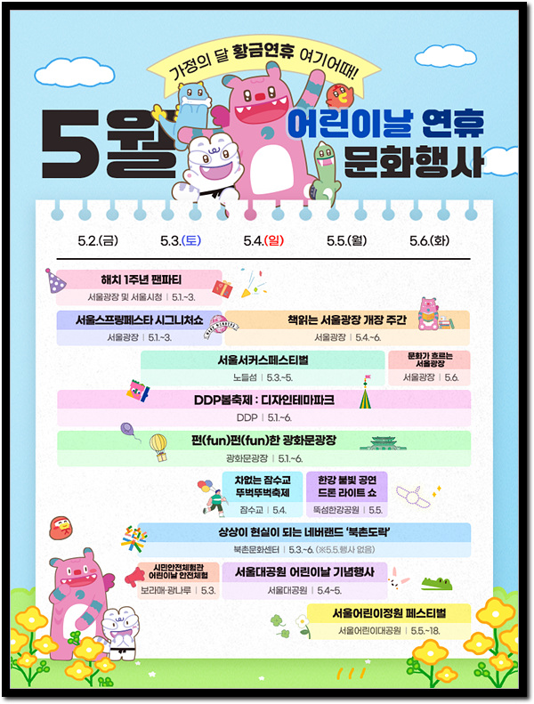 5월 황금연휴를 맞아 어디를 갈까? 고민이라면 서울 곳곳에서 펼쳐지는 다채로운 축제와 문화행사에 관심을 가져 보시면 어떨까요?