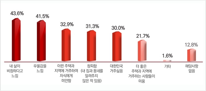 이때 느껴본 감정은 비참함(43.6%)과 우울감(41.5%)이 가장 컸습니다. ‘이런 주택에 거주해 자식에게 미안함을 느꼈다’는 응답자도 32.9% 있었고 창피함 때문에 본인이 거주하는 집과 동네를 알려주지 않은 적이 있다고 답한 이들도 31.3%인 것으로 조사돼 놀라움을 자아냈습니다. 5명 중 한 명(21.7%)은 ‘더 좋은 주택·지역에 사는 사람들이 미워질 정도다’라고도 답했습니다.