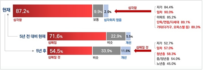 미래 전망은 더 암울합니다. 응답자 절반 이상인 54.5%는 5년 뒤 주거불평등이 더욱 심해질 것이라고 전망했는데 특히 청년층(58.3%)이 노년층(45.0%)에 비해 미래 주거불평등 정도를 전망하는 시각이 더욱 부정적이었습니다.