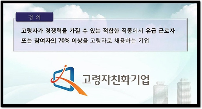 고령자친화기업이란 다수의 고령자 (60세 이상)를 근로자로 직접 고용하기 위해 보건복지부에서 지정한 기업입니다.