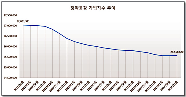 상황이 이렇자 시세와 비슷하거나 오히려 더 비싼 분양가가 속출하기도 했습니다. 때문에 청약 통장을 해지해버리는 사람들도 늘었습니다. 한국부동산원 청약홈이 집계한 결과에 따르면, 지난 3월 말 기준으로 청약종합저축 가입자 수는 2,556만 8,620명입니다. 청약 통장 가입자가 ‘역대 최고’를 기록했던 지난 2022년 6월 (2,703만 1,911명)에 비하면 5%가 하락했습니다.