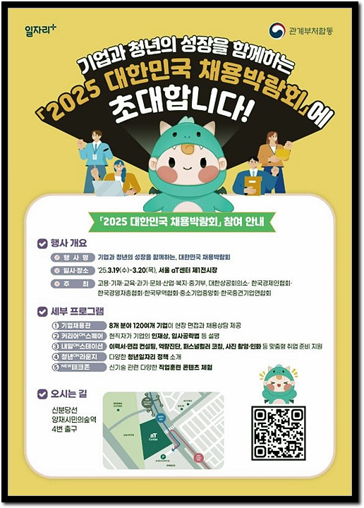 2025년 3월 19일 (수)부터 20일 (목)까지 서울 aT센터에서 열리는 이번 채용박람회는 약 120개의 기업이 참여하여 다양한 직무와 산업군의 채용 정보를 제공합니다.