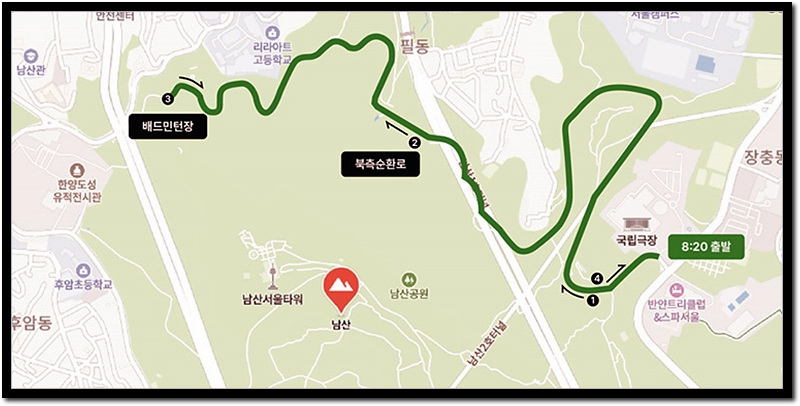 A 코스는 난이도가 높지 않은 코스로 오전 8시 20분 남산국립극장에서 출발하여 북측순환로를 따라 걷다가 반환점을 돌아 다시 국립극장으로 돌아오는 왕복 6km 코스로, 약 1시간 30분이 소요될 예정입니다.