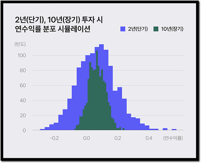 즉 2년 단기투자보다는 10년 장기투자가 불확실성의 범위가 훨씬 좁아진다는 결과를 간단하게 확인할 수 있습니다.