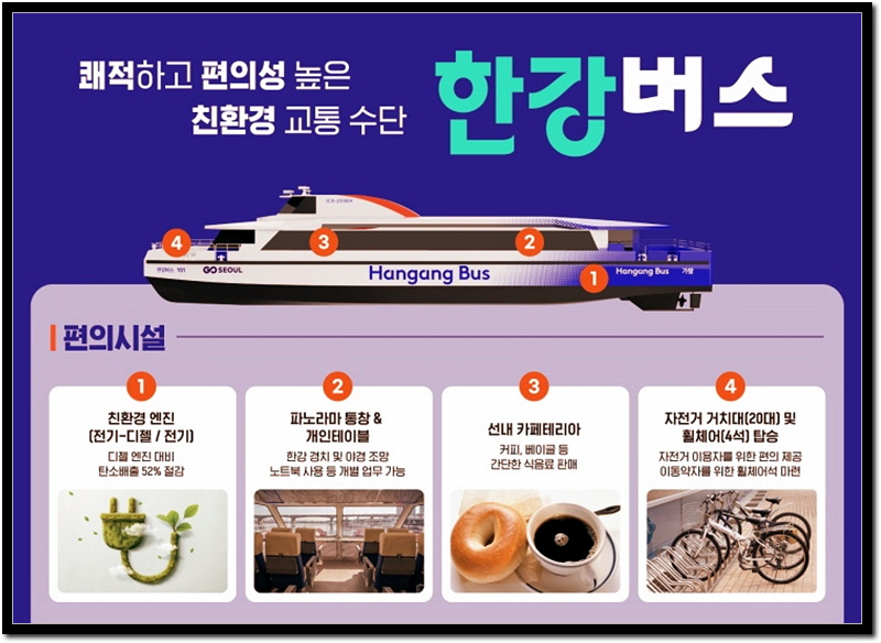 또한, 한강버스는 선착장 인근에서 열리는 버스킹 공연, 한강페스티벌 등 다채로운 문화행사와도 연계하여 참여 시민의 즐거움을 더해나갈 전망이라고 하니 많은 분들이 참여하였으면 합니다.