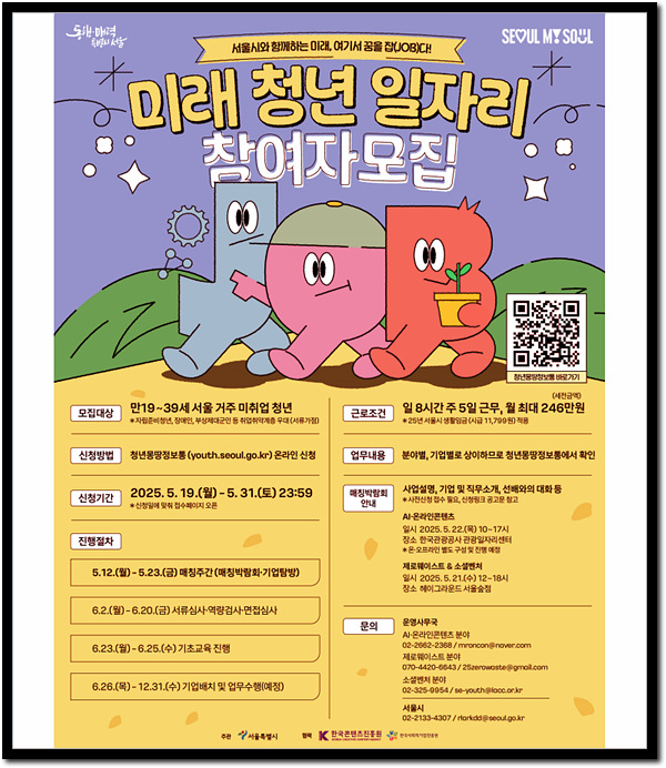 서울시는 경기불황, 고용한파 속에서 힘든 시간을 보내고 있는 미취업 청년들을 위해 ‘미래 청년 일자리 사업’을 실시합니다.