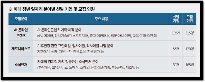 기존의 온라인콘텐츠 분야에 인공지능 (AI)이 새롭게 추가됐으며, 특히 지난해 미래 청년 일자리 프로그램에 참여한 청년의 절반 이상을 정식 채용한 ‘고용 연계 우수기업’을 우선 선발했다는 점이 눈에 띕니다.