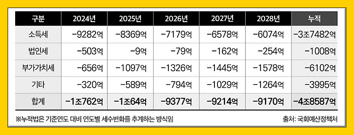 순액법 (각 연도에 전년 대비 증가한 세수를 집계) 기준으로 5년간 세수 감소 규모는 7,994억 원으로 예측됐는데, 약 76%(6,074억 원)가 소득세제 분야에 쏠려있습니다.