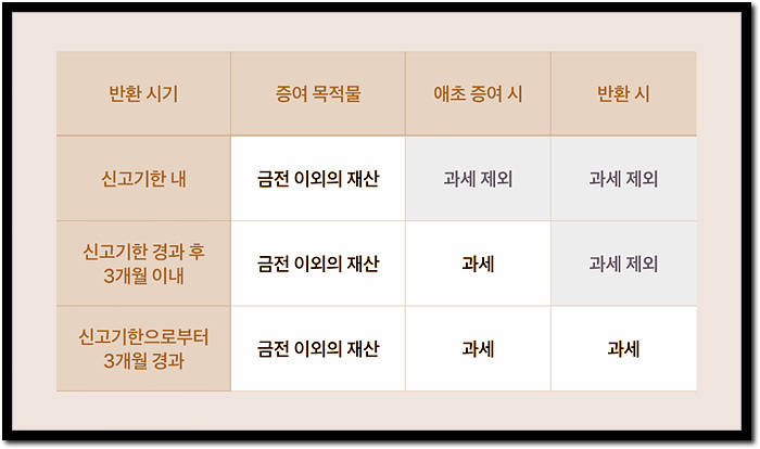 참고로 증여 재산 중 현금의 경우, 신고기한 내 반환 여부와 관계없이 증여세가 부과되니 주의해야 합니다.