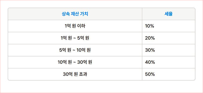 예를 들어, 상속받은 재산의 가치가 1억 원 이하일 경우 세율은 10%이며, 1억 원에서 5억 원 사이일 경우 20%가 적용됩니다. 5억 원에서 10억 원 사이의 재산에 대해서는 30%, 10억 원에서 30억 원 사이의 재산에 대해서는 40%, 30억 원 이상의 재산에 대해서는 50%의 세율이 적용됩니다. 아래의 표를 참고해 주세요.