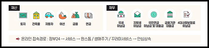 "안심상속 원스톱서비스"를 이용하면 피상속인의 재산과 채무를 알 수 있습니다. 안심상속 원스톱서비스는 피상속인의 재산·채무를 알기 어려운 상속인이 피상속인의 각종 재산·채무를 한 번에 조회할 수 있도록 정부에서 제공하고 있는 서비스입니다. 이 서비스는 온라인 (정부24) 또는 시·구청, 주민 센터에 방문하여 신청할 수 있습니다.