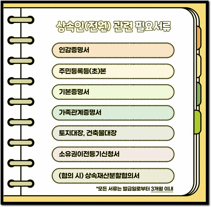 상속세를 납부하기 위해서는 몇 가지 서류가 필요합니다. 필요한 서류는 다음과 같습니다.