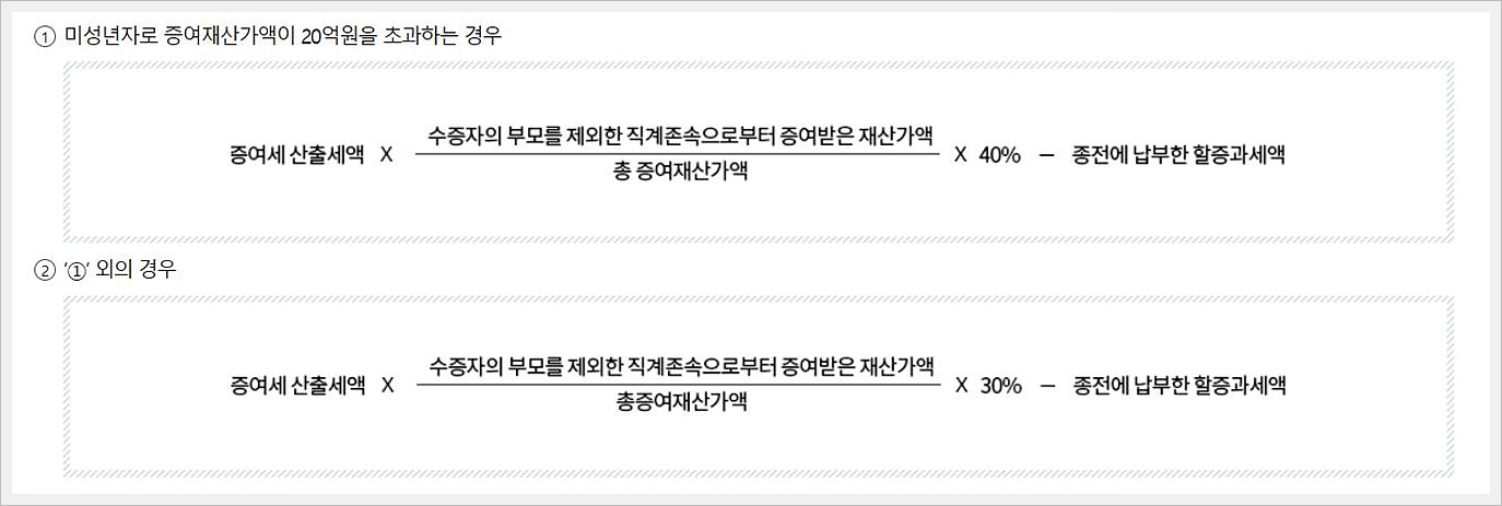 손자, 손녀가 미성년자이면서 증여 재산 가액이 20억 원을 초과한다면 증여세는 40%까지 할증됩니다.