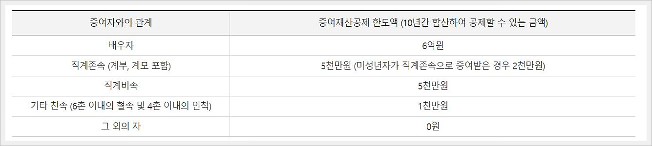 증여재산공제제도는 수증자와 증여자가 인적 관계에 있는 경우 증여세 과세액에서 일정금액을 공제해 과세표준을 산정하는 제도입니다.