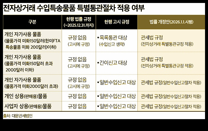 2026년 1월 1일부터 시행되는 관세법 개정안은 전자상거래로 수입되는 물품 중에서 개인이 자가 사용으로 수입하는 물품에 대해서만 전자상거래물품 특별통관절차를 적용한다는 소식입니다.
