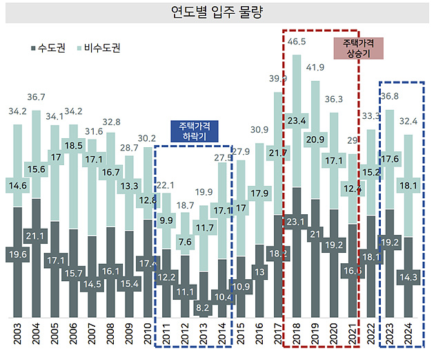 주택 가격에 가장 큰 영향을 준다고 보는 공급 변수는 입주물량입니다. 비수도권의 경우 부동산 시장 침체로 수요가 급감한 상황에서도 입주물량은 오히려 늘어나 가격 하락이 심화할 가능성이 있습니다.