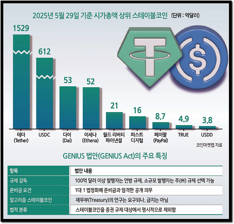 2025년 5월 기준으로, Tether는 약 1,529억 달러의 시장 가치를 기록하며 가장 큰 스테이블코인으로 자리잡고 있습니다.