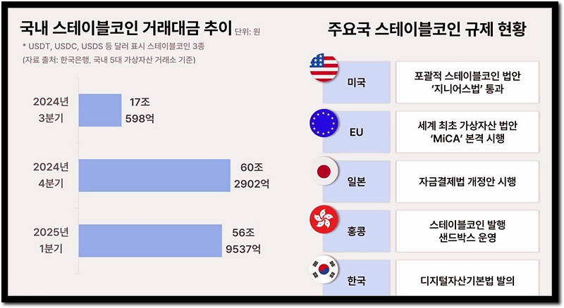 미국, 유럽연합, 일본, 홍콩, 한국 등 여러 나라에서 스테이블코인에 대한 법적 프레임워크가 마련되고 있으며, 이는 스테이블코인의 안정성과 신뢰성을 높이는 데 기여할 것입니다.