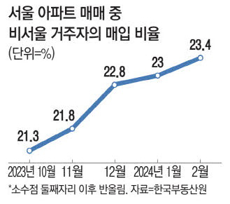 실제로 서울이 아닌 수도권과 지방에 거주하는 사람들이 서울 아파트를 매수하는 비중이 늘고 있습니다. 한국부동산원에 따르면, 서울 아파트 매매에서 서울 외 거주자 비중은 지난해 10월 21.3%에서 2월 23.5%로 2% 포인트 늘어난 것으로 나타났습니다.
