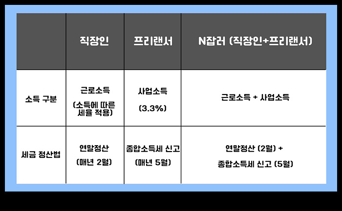 예를 들어, 직장인은 연말정산을 통해 근로소득세를 정산하지만, 프리랜서나 자영업자는 종합소득세 신고를 통해 사업소득을 신고해야 합니다.