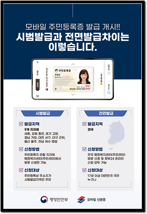 행정안전부는 지난해 말부터 시범 운영 중인 모바일 주민등록증 발급 지역을 오는 2월 14일(금)부터 3월 14일(금)까지 전국으로 확대한다고 밝혔습니다.