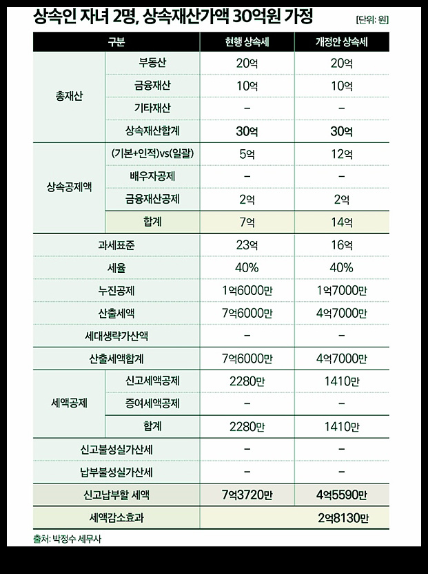 개정안에 따르면, 자녀 2명에게 상속할 때 공제금액은 기존보다 7억 원이 증가합니다.
