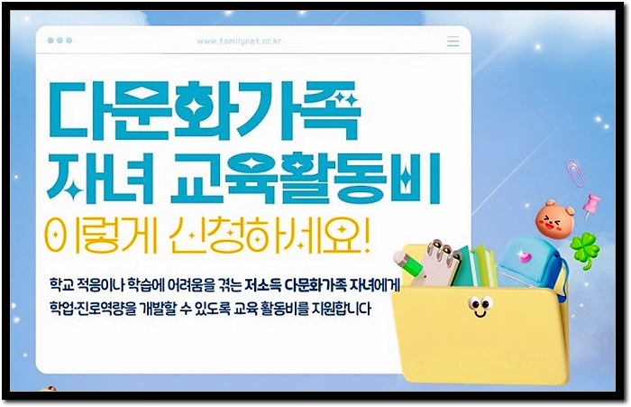 이 사업은 학교 적응이나 학습에 어려움을 겪는 저소득 다문화가족 자녀에게 학업 및 진로 역량을 개발할 수 있도록 다양한 교육 기회를 보장하기 위해 지난해부터 시작되었는데요, 이번 포스트에서는 교육활동비 지원에 대한 내용을 안내해 드리겠습니다.