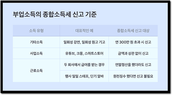 부업을 통해 얻은 소득이 연 300만 원을 초과할 경우, 종합소득세 신고를 해야 할 의무가 생깁니다.