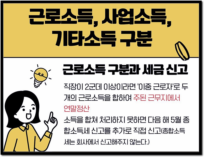 첫째, 사업소득 입니다. 이는 정기적이고 지속적인 소득으로, 예를 들어 배달 아르바이트나 프리랜서로 일하는 경우가 해당됩니다. 둘째, 기타 소득입니다. 이는 불규칙적이고 일회성 소득으로, 예를 들어 강연 등 일회성 사례금 등이 이에 해당합니다.