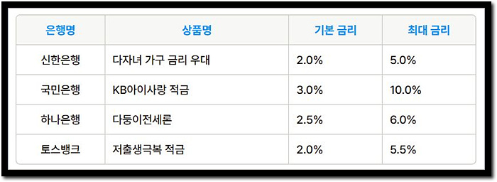 또한, KB국민은행의 'KB아이사랑 적금'은 최고 연 10%의 금리를 제공하여 많은 부모들에게 인기를 끌고 있습니다.