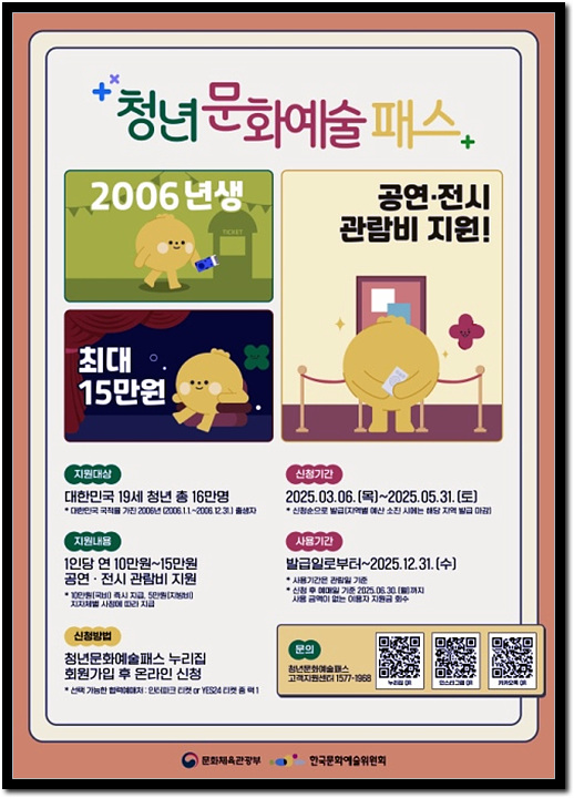 문화체육관광부가 올해 19세가 되는 2006년생 청년에게 최대 15만 원을 지원하는 '청년 문화예술패스'를 오는 6일부터 발급한다는 좋은 소식이 있습니다.
