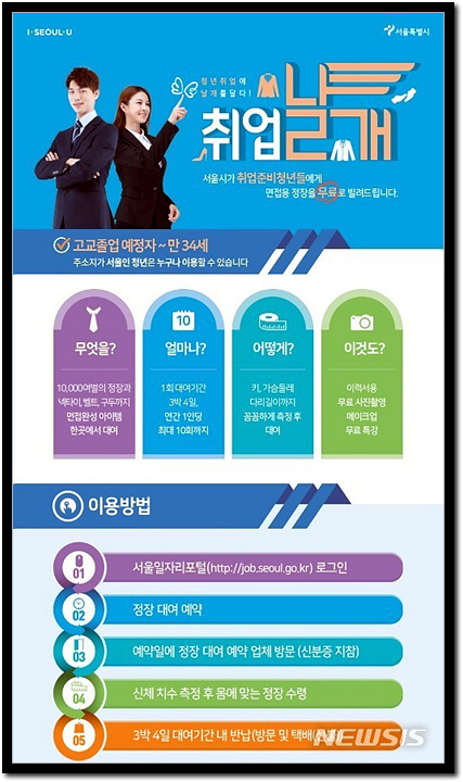 서울시는 청년 취업 준비생들을 위해 면접 정장을 무료로 대여해 주는 '취업날개 서비스'를 운영하고 있습니다.