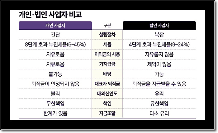 개인 사업자의 세율은 8단계 초과누진세율 (6~45%)로, 법인 사업자의 4단계 초과누진세율 (9~24%) 보다 높습니다.