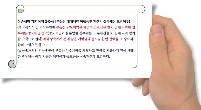 이를 기준으로 위의 사례를 보면 아버지는 잔금도 받지 못하였고, 등기도 넘겨준 것이 아니기 때문에, 상속 개시일 현재는 계약 중인 부동산을 보유한 것으로 보아야 합니다.