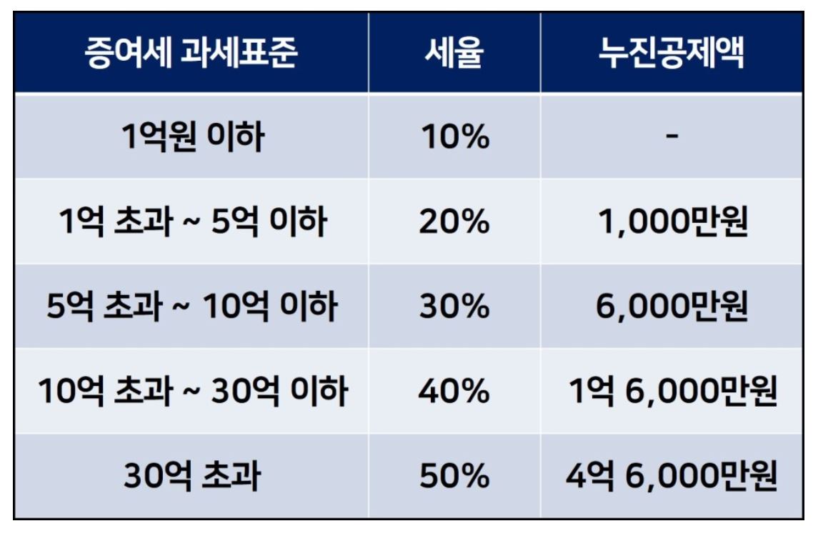 다음으로 증여 후 10년 내 상속 시 상속세 (상속재산 10억 원 + 사전증여재산 10억 원) -상속공제액 11억 원 = 9억 원 X 세율 30% = 2억 7,000만 원 – 누진공제액 6,000만 원 = 2억 1,000만 원 – 1억 6,000만 원 (사전증여세 납부액) = 5,000만 원 3) 세 부담 비교
