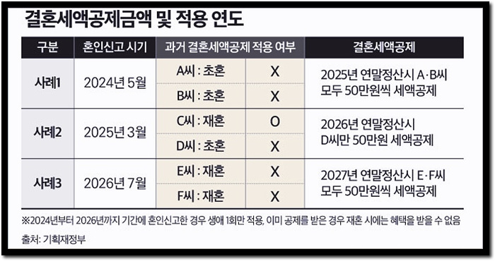 2024년부터 2026년까지 혼인 신고를 했다면, 연말정산을 할 때 50만 원의 세액공제를 적용할 수 있기 때문입니다.