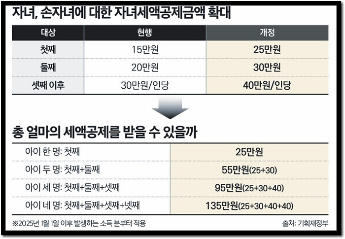 세법 개정으로 첫째는 연 25만 원, 둘째는 30만 원, 셋째 이상은 40만 원으로 공제액이 10만 원씩 늘어납니다.