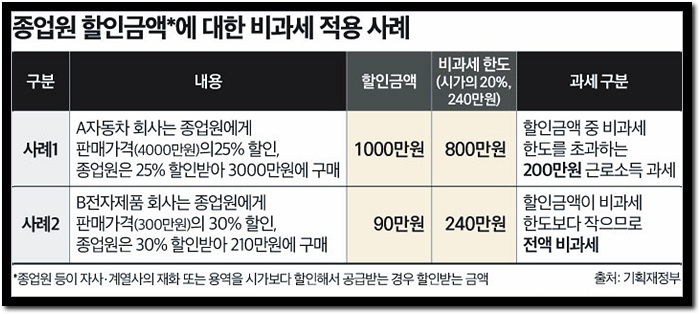 다만 할인 금액 중 '시가의 20%, 240만 원' 한도로 비과세가 적용됩니다.
