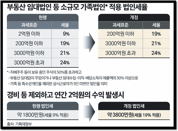 현재 가족법인에 적용되는 최저 세율은 9% (과세표준 구간 2억 원)인데, 내년부터는 최저 세율 구간이 '과표 200억 원 이하, 19%'로 크게 오릅니다.